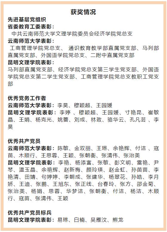 党委常务副书记杨世红同志宣读了受省委教育工委表彰的“两优一先”名单,宣读了《中共云南师范大学委员会关于表彰优秀共产党员、优秀党务工作者、先进基层党组织的决定》,宣读了《中共云南师范大学文理学院委员会关于表彰先进基层党组织、优秀共产党员标兵、优秀共产党员及优秀党务工作者的决定》。会上,学院党政领导班子成员分批为获得表彰的优秀共产党员、优秀党务工作者、先进基层党组织颁发荣誉证书、奖牌。