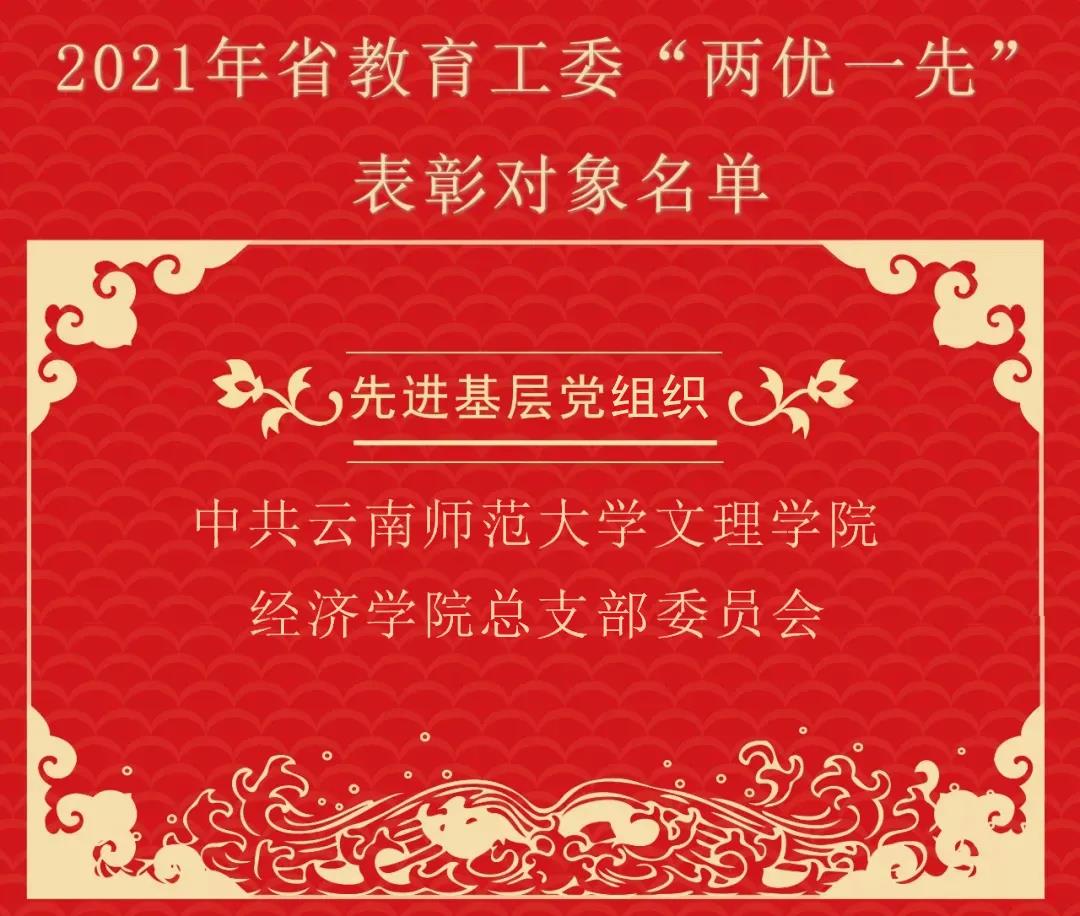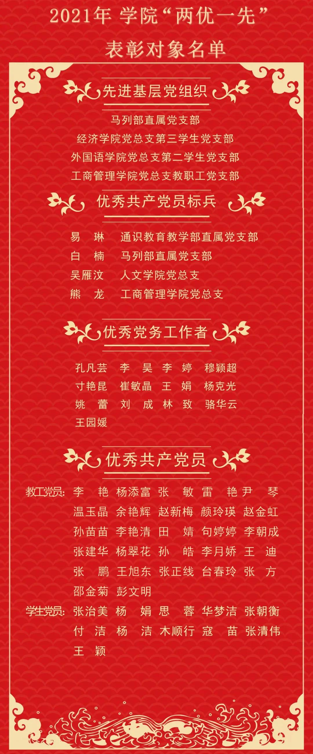 为庆祝中国共产党成立100周年。各级党组织开展了“两优一先”评选活动,经过各级党组织遵循评选程序,认真审核把关,本年度学院共产生云南省教育工委表彰先进基层党组织1个;中共云南师范大学委员会表彰先进基层党组织4个,优秀党务工作者3名,优秀共产党员12名;中共云南师范大学文理学院委员会表彰先进基层党组织4个,优秀共产党员标兵4名,优秀党务工作者13名,优秀共产党员38名,具体情况如下: