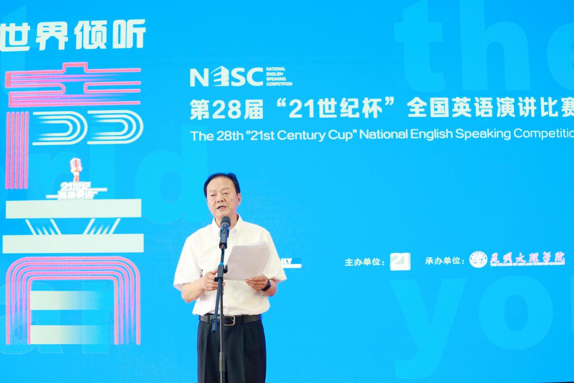 决赛现场,昆明文理学院副校长杨涛致辞,他表示,作为教育部官方认可的全国赛事之一,每年有千余所高等院校的数十万名大学生选手报名参与赛事,为广大英语教育工作者和英语学习者提供了一个高水平、专业性的学习交流平台。我们非常高兴中国日报和“21世纪杯”全国英语演讲比赛组委会选择我院作为承办单位。在今天的国际环境下,我们急需有中国的声音,能够以全世界人民能够喜闻乐见的方式,传达中国的观点和看法。我们期待今天精彩的比赛和各位精彩的表演,希望大家不仅能够展现出优异的英语语言能力,更能展现出一个中国外语人的风采,为世界文明的发展做出当代中国大学生应有的贡献。